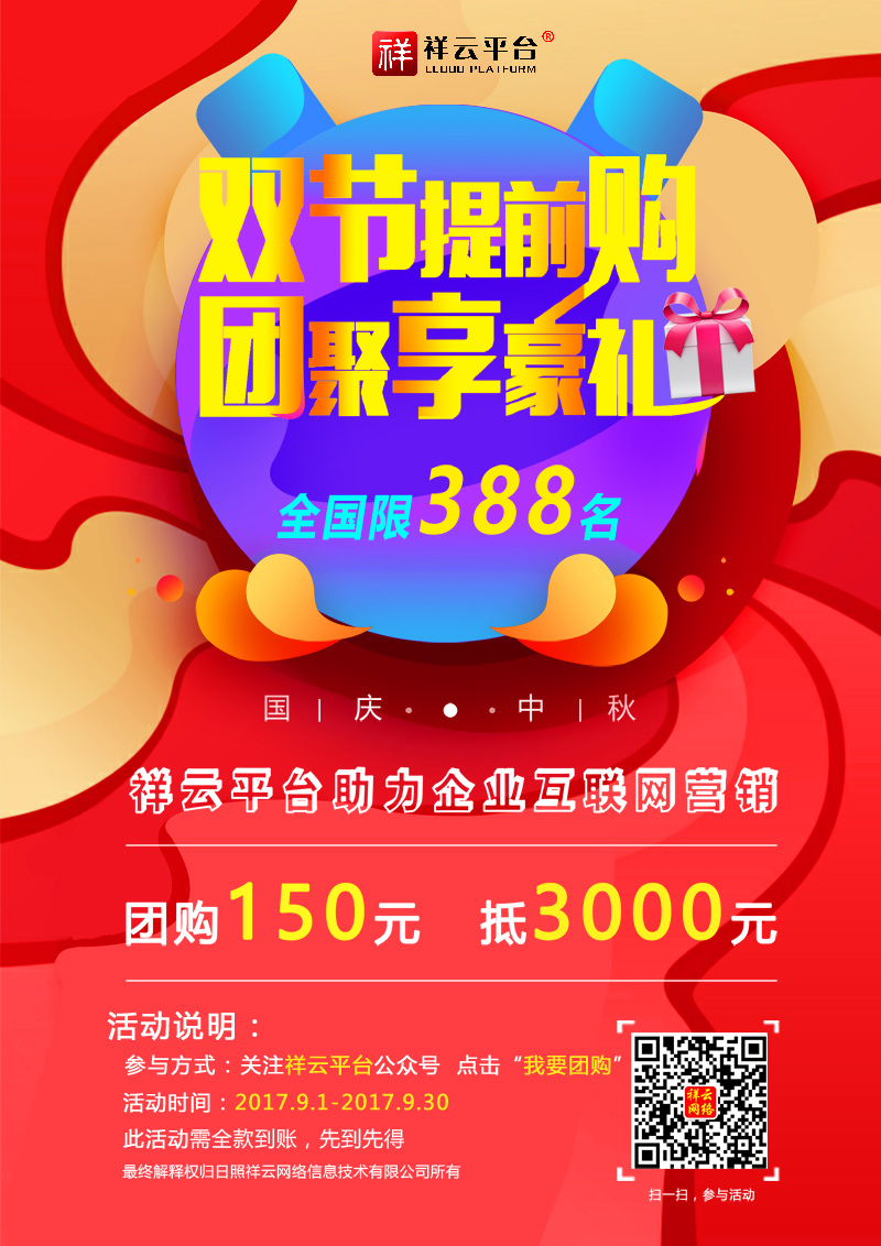 迎中秋,慶國慶,值此雙節(jié)來臨之際,祥云網絡助理企業(yè)互聯(lián)網營銷,團購150元抵3000元;顒舆M行中……