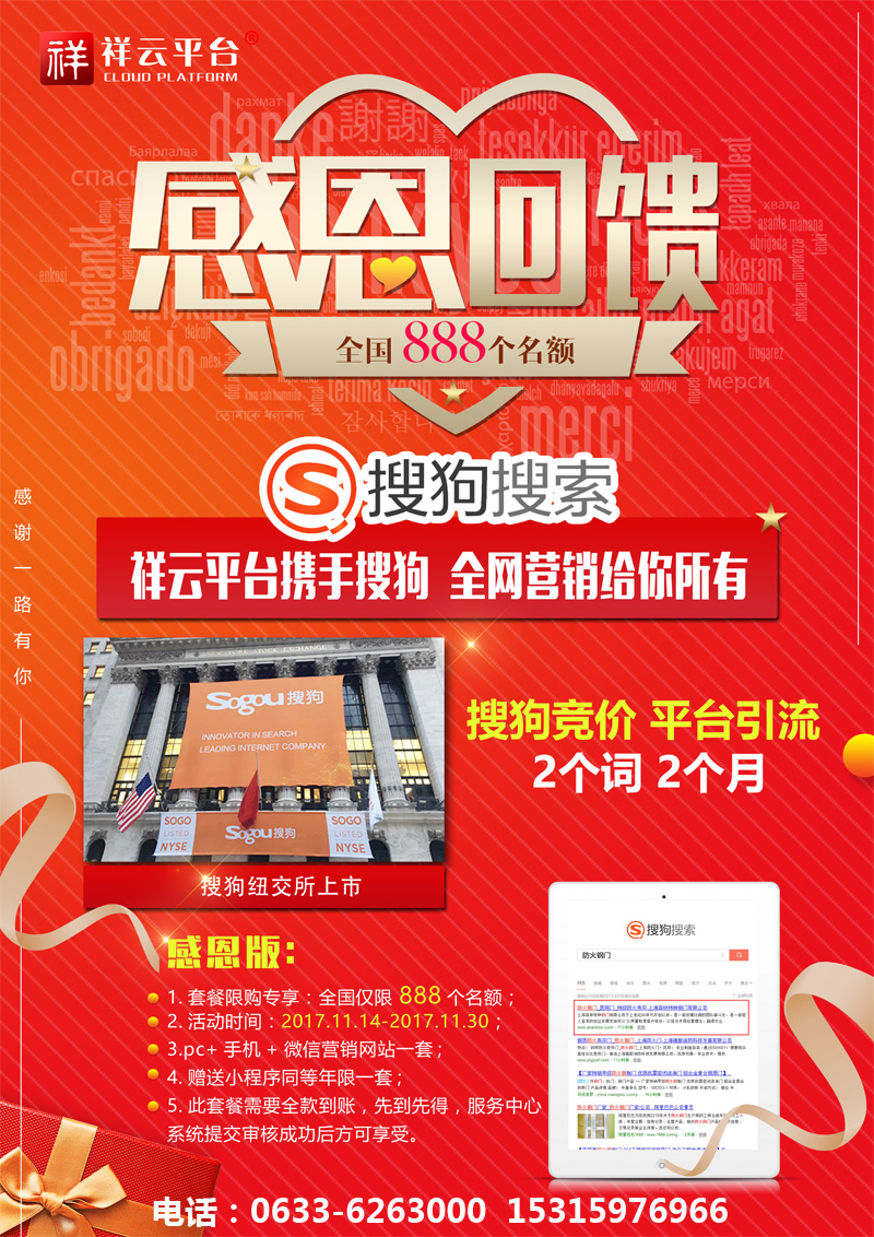 2017年11月9日,搜狗在紐交所上市,成為國內第二大搜索引擎,祥云聯(lián)合搜狗,推出2017感恩鉅惠活動:凡簽約祥云營銷型網(wǎng)站,即送搜狗競價關鍵詞,兩個詞,兩個月!名額有限,先到先得!電話:0633-6263000 15315976966